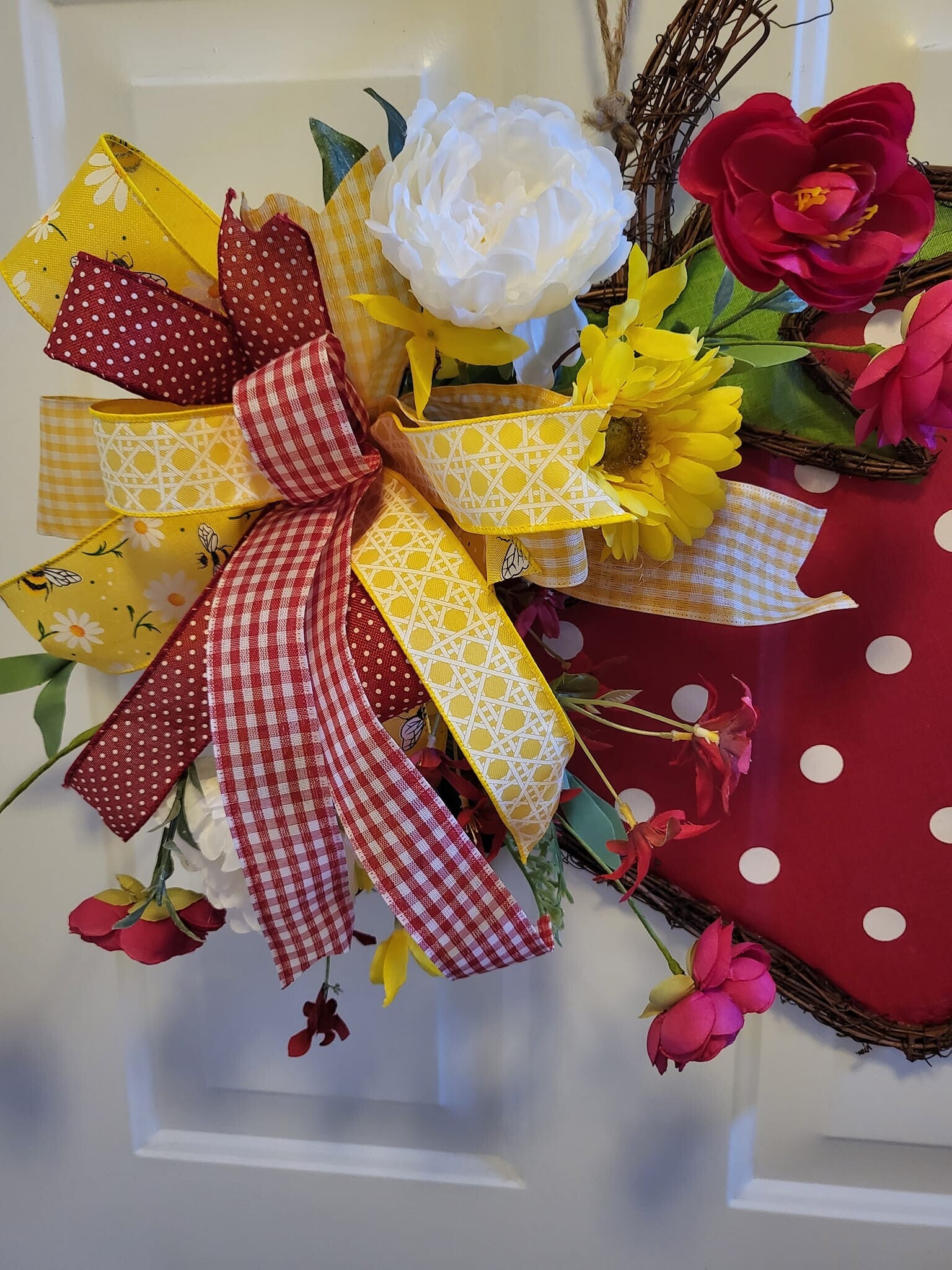 Strawbeery picking is coming soon. Nice large door strawbeery hanger, sunflowers peone, red flowers, assorted red and yellow ribbon