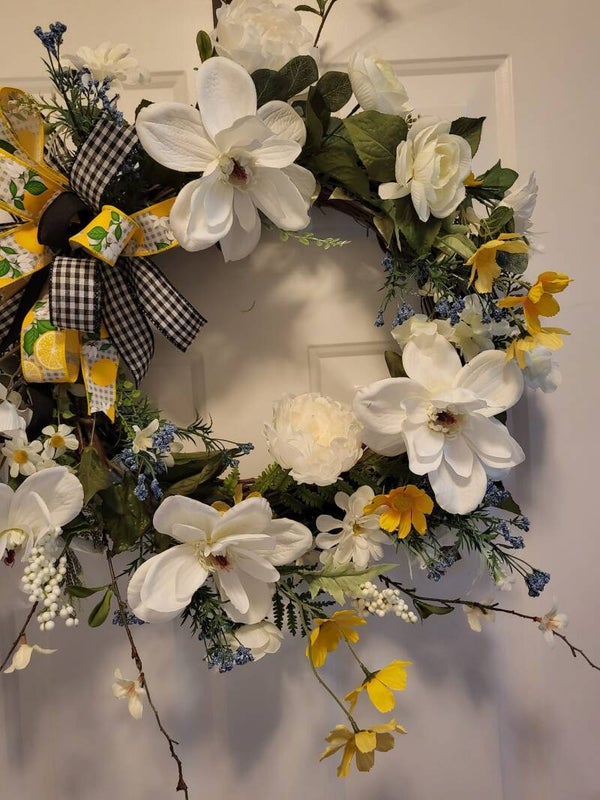 Grapevine wreath, large magnolias, yellow, light blue, assorted greens, with an assorted selection of ribbons.