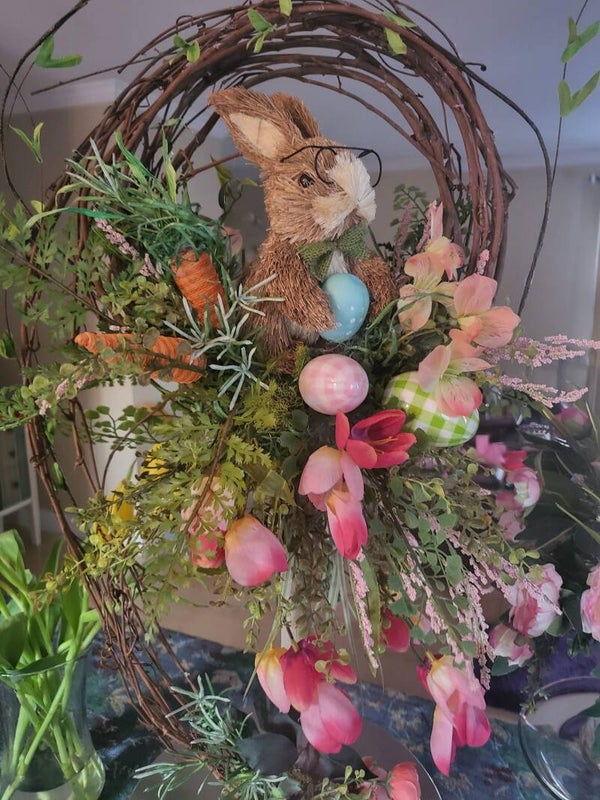 Grapevine wreath attached a top a wooden candle stick holder. Bunny with glasses sit on top of the candle stick holder with grasses and moss. Lively assorted greens and real to the touch feel. Silk tulips, assorted easter eggs.