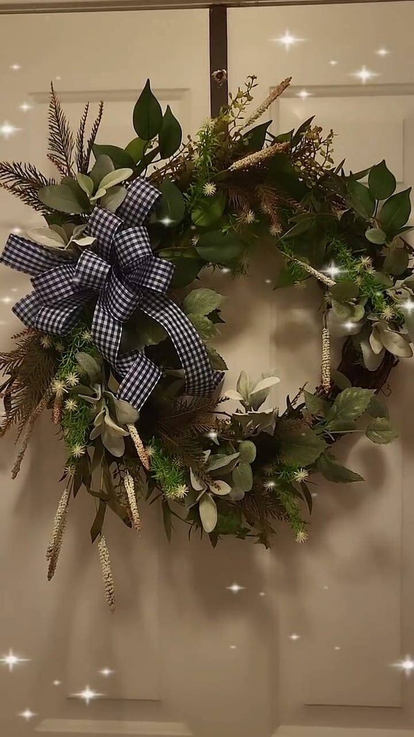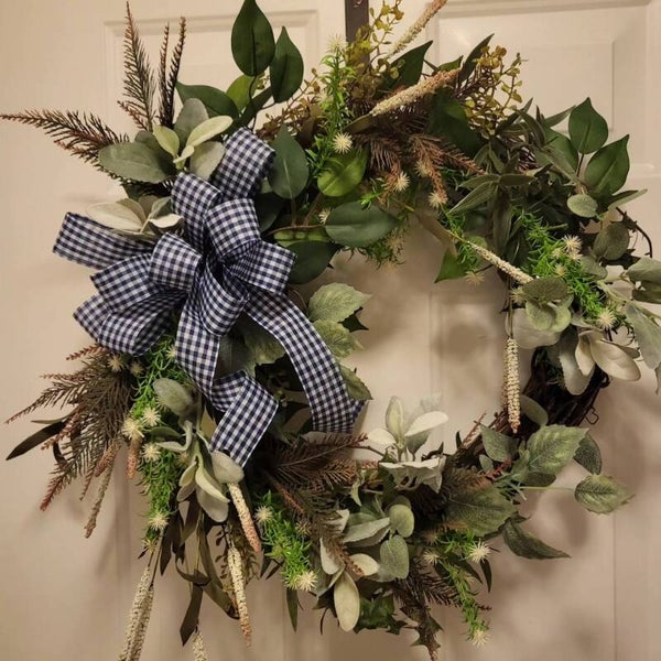 Grapevine wreath, with assorted greenery, blue gingham ribbon. No two wreaths will ever be alike unless requested.