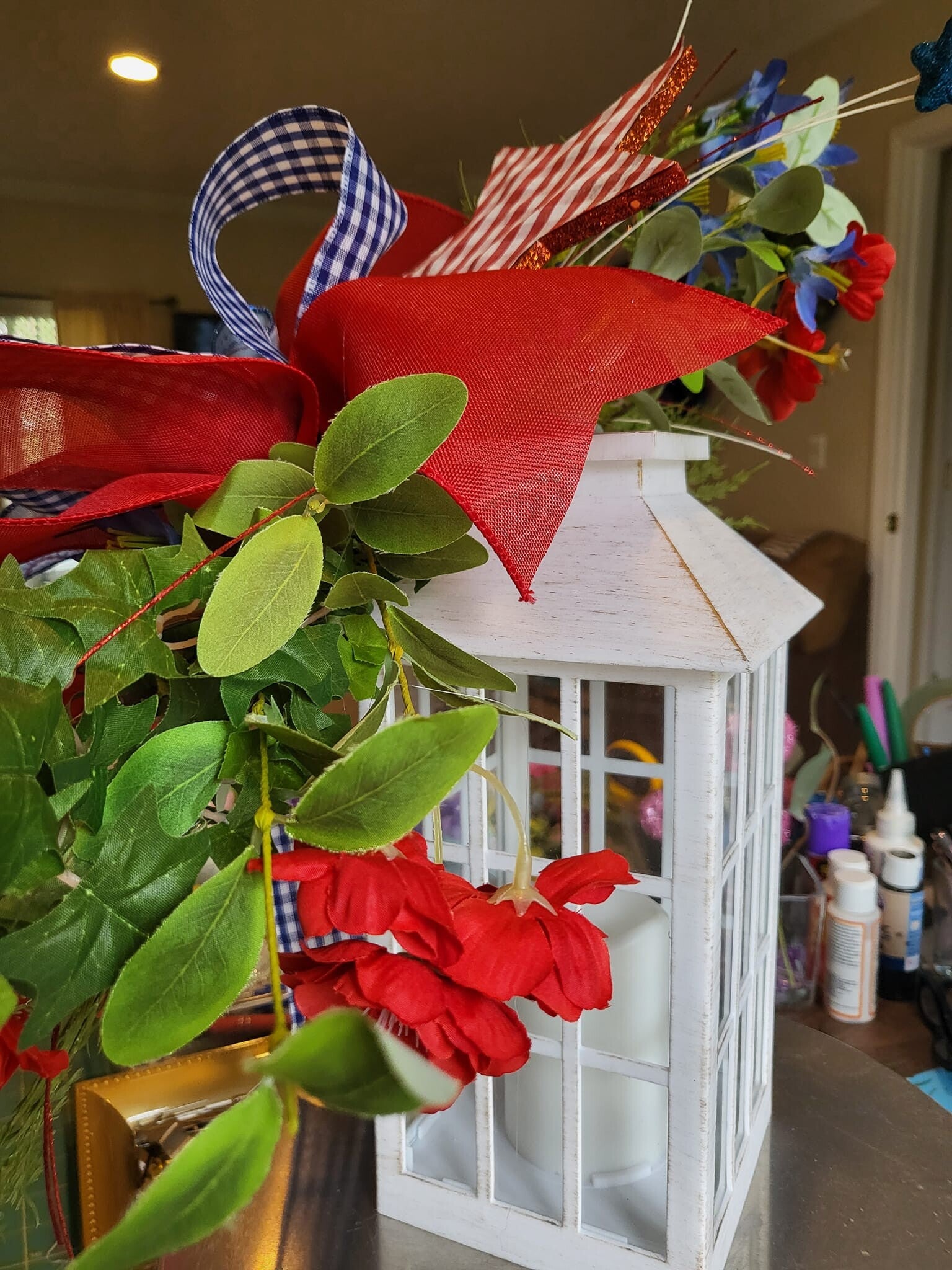 A country white lantern decorated with greenery and assorted florals. This one is decorated in Red White and Blue
