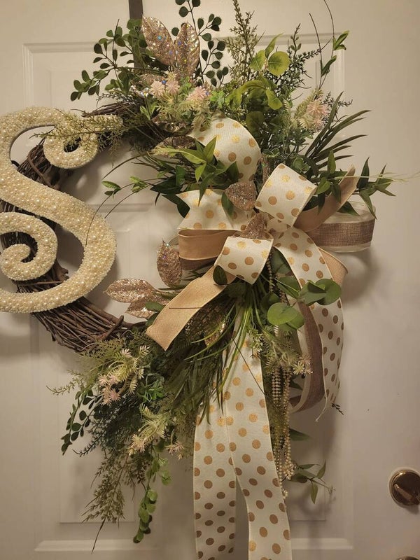 Grapevine wreath, attached pearl wooden letter, assorted greeneries, maiden fern, wild eucalyptus vine, god specked leaf, assorted ribbon.