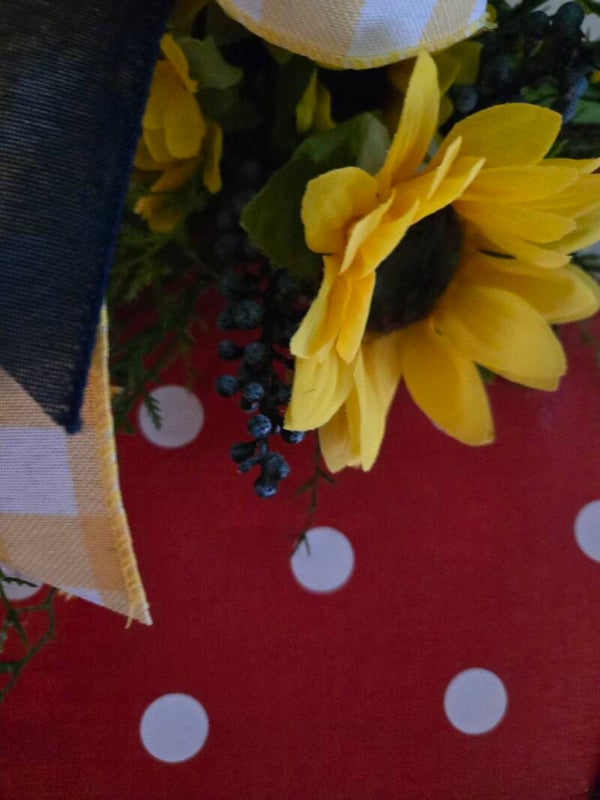 Strawberry, adorned with sunflowers l, assorted greenery and fillers of little yellow flowers and blue berries